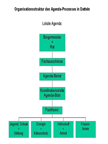 Die Beteiligung von vielen Menschen und Interessen und der Eingriff in die Entwicklung der Kommune erfordert eine gute Organisation, Leitung und Koordination des Prozesses. Zentrale Organisationselemente eines Agenda-Prozesses können sein:
