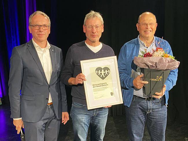Zwei Auszeichnungen hat Bürgermeister André Dora 2019 beim 9. Dattelner Ehrenamtstag vergeben: Den Ehrenamtspreis überreichte er Klaus Pauly, der sich seit über 20 Jahren als Platzwart im Ostringstadion engagiert. Eine besondere Auszeichnung erhielt das Team E.f.a., das seit 30 Jahren einen Flohmarkt fürs Kind veranstaltet und den Erlös für karitative Zwecke spendet.