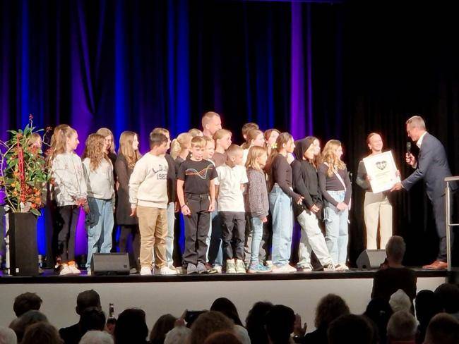 1.10.2024 - Mit dem "Jungen Ehrenamtspreis" zeichnete Bürgermeister André Dora das Dattelner Kinder- und Jugendparlament in der Stadthalle aus. Sylvia Jaisfeld bekam den Ehrenamtspreis für ihr 20-jähriges Engagement als Leiterin des Chores InTakt. Da sie verhindert war, nahmen ihr Mann Reinhard und Diethard Klaßen, Mitbegünder des Chores, den Preis stellvertretend entgegen.