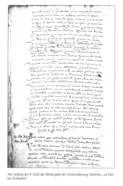Und die gibt es: auf einer Papsturkunde aus dem Jahr 1147. Dort ist für Datteln der Name „Datlen“ und kurze Zeit danach dreimal der Name „Dattilo“ überliefert.