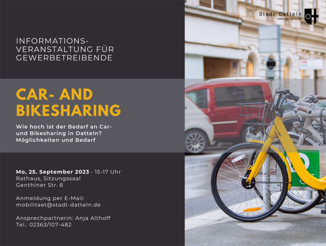 Wie hoch ist der Bedarf an Car- und Bikesharing in Datteln? Um das herauszufinden, hat die Stadt Datteln ein Fachbüro beauftragt, eine Bedarfsanalyse zu erstellen. Bei einer Informationsveranstaltung am Montag, 25. September 2023, im Sitzungssaal des Rathauses soll mit Gewerbetreibenden in Datteln erarbeitet werden, wie Car- und (Lasten-)Pedelecsharing für unsere Stadt ausgestaltet sein muss. Die Veranstaltung beginnt um 15 Uhr und dauert voraussichtlich bis 17 Uhr.