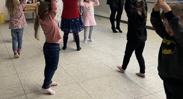 Das Foto zeigt Tanzpädagogin Sandra Müller-Lempka (3. von rechts), die mit Kindern im Tanzprojekt der Musikschule tanzt.