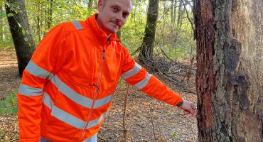 Das Bild zeigt KSD-Baumpflegemeister Lukas Glockzin, der beispielhaft auf einen Pilzbefall an einer Eiche hinweist. Das Bild entstand im vergangenen Jahr im Berliner Busch, wo auch mehrere Bäume gefällt werden mussten.