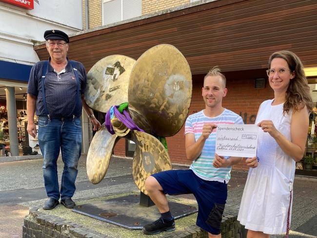 Das Bild zeigt Andreas Kracke, der einen Scheck über 1.000 Euro an Dr. Anna Lenz von der Kinderschutzambulanz übergibt. Im Gegenzug bekommt er die Schiffsschraube zurück, die 22 Jahre in der Hohen Straße vor Blumen Risse stand. Sein Vater Jörg Kracke (im Bild links) hatte die Schraube 2022 für eine Initiative zru Aufwertung der Innenstadt gespendet.