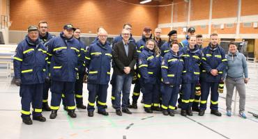 Bürgermeister André Dora und Sozialdezernent Peter Wenzel bedankten sich bei den THW-Mitgliedern für ihren Einsatz - sie hatten die Notunterkunft zuvor bereits eingerichtet.