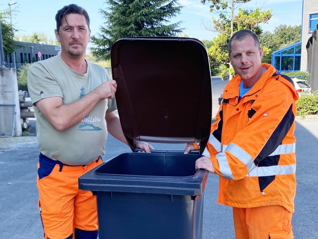 Foto: Christian Schulwandt (links) und Marcel Lissowski vom KSD mit einer Biotonne.
