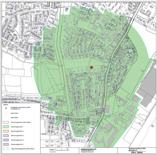 Wird ein Blindgänger mit Zünder an der Theiheide gefunden, müsste das Ida-Noll-Seniorenzentrum geräumt werden. Bei einem Blindgängerfund am Möllerskamp müsste das Seniorenzentrum erst geräumt werden, wenn ein Radius von mindestens 500 Metern erforderlich wäre. Mitarbeiter*innen des Dattelner Ordnungsamts und der Feuerwehr sind bereits in Kontakt mit der Leitung des Hauses. Wegen der Schulferien, die nächste Woche beginnen, sind die Gustav-Adolf-Schule und das städtische Familienzentrum ARIKUS nicht von einer möglichen Evakuierung betroffen.