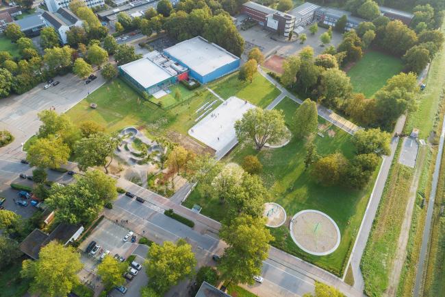 Auf dem Pumptrack - inklusive Steilkurve - können BMX-Fahrer, Scooter und auch Inliner fahren. Außerdem gibt es ein (Beach-)Volleyball- und ein Badmintonfeld, verschiedene Calisthenics-Angebote, eine Boule-Bahn, Bewegungsmöglichkeiten für Menschen mit Handicap und eine Seilpyramide als Klettergerät. Eine WC-Anlage ist ebenfalls vorhanden.