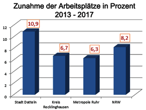 Damit hat die Zahl der Arbeitsplätze in Datteln stärker als in NRW (+ 8,2%), der Metropole Ruhr (+ 6,3%) und im Kreis Recklinghausen (+ 6,7%) zugenommen.
